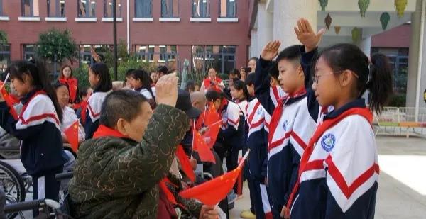 小朋友们排着整齐的队伍来到长者们面前,轻轻地为爷爷奶奶戴上红领巾,孩子们手中鲜艳的国旗,映红了稚嫩的脸庞,更照亮了爷爷奶奶的微笑。
